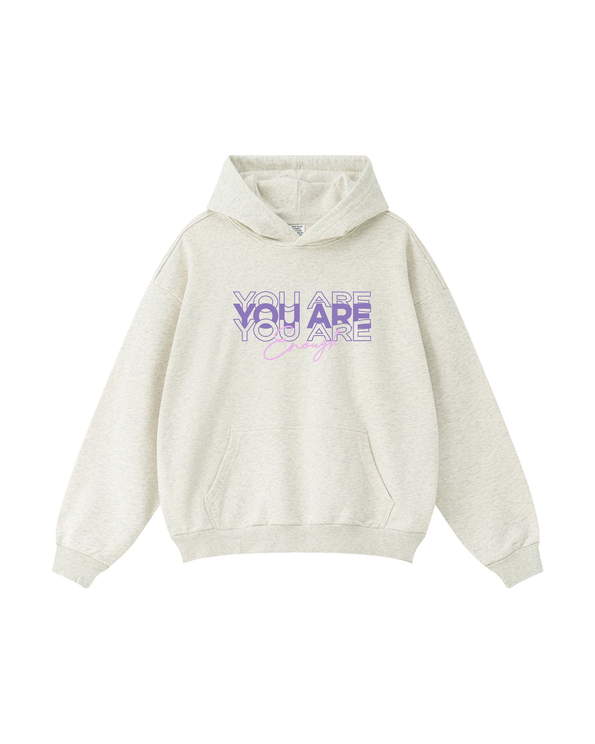 This oatmeal-toned hoodie features a layered “YOU ARE” statement with a soft script “Enough”—a simple, uplifting message for everyday confidence and comfort.