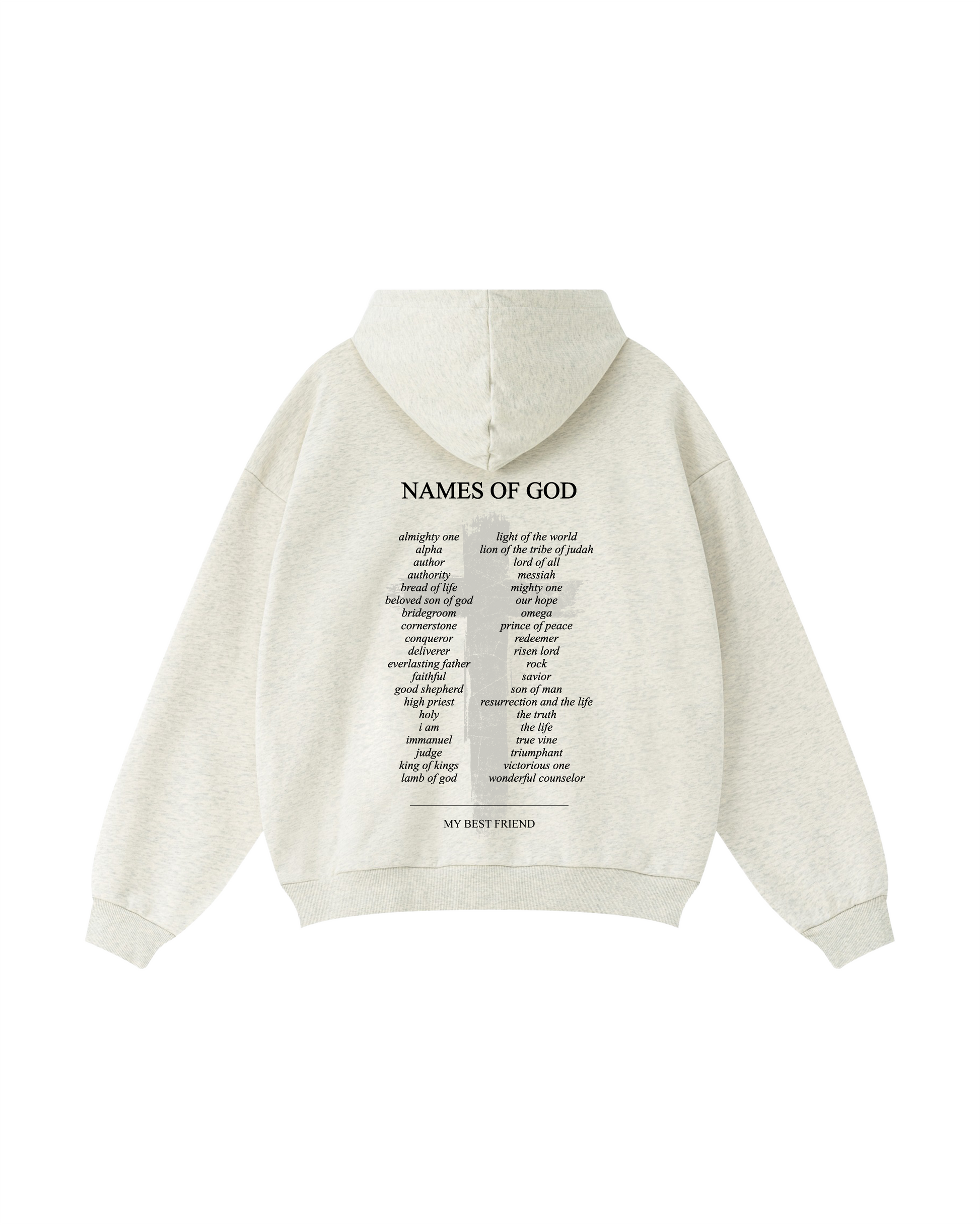 A soft, everyday hoodie featuring a faded cross and a list of powerful names of God — finished with “My Best Friend” as a gentle reminder you can wear.